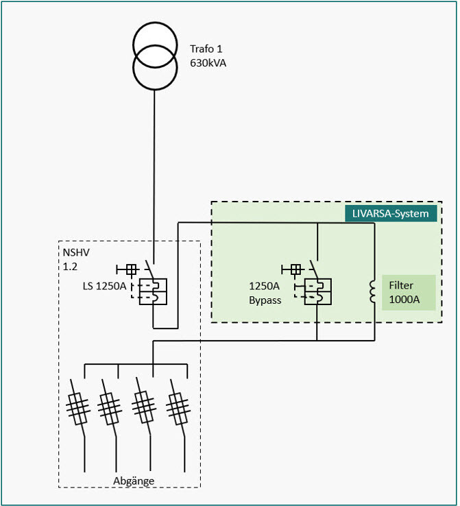 Der elektrische Effizienzfilter wird nach dem Mittelspannungstransformator im 400V Dreiphasennetz installiert. Für höhere Spannungsebenen, wie zum Beispiel 500V- oder 690V, ist der Effizienzfilter derzeit noch nicht verfügbar